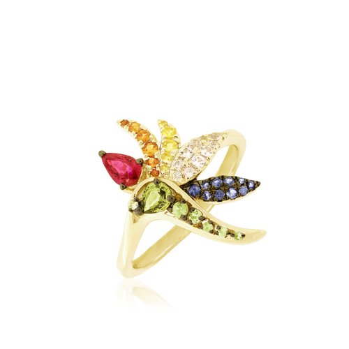 14K yellow gold Bird of Paradise Size 14mm (35/64 inch) x 21mm (53/64 inch) Color Sapphires 0.72ct White Sapphires 0.37ct