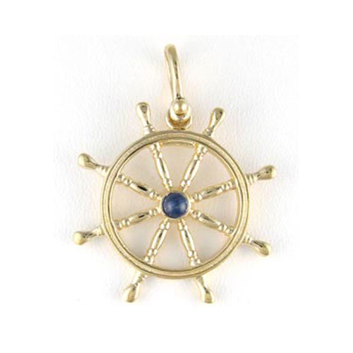 14k gold large ship's wheel with sapphire pendant - 349 s